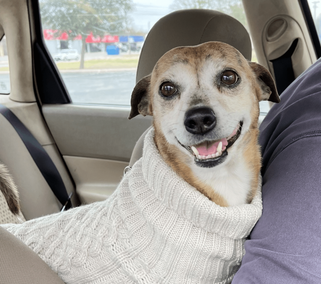 This is Leo wearing his turtleneck sweater and living his best life—in the car, of course— while my aunt takes a picture.