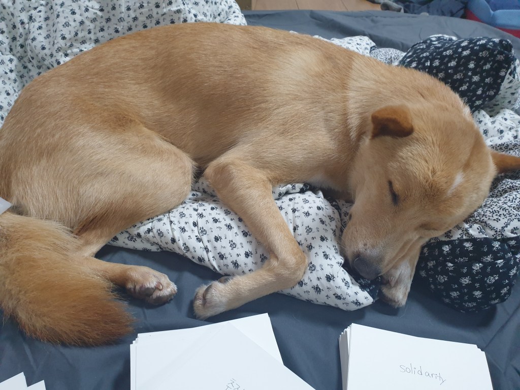 I have a Jindo puppy/queen of the house named Mabel (after one of my favorite Gravity Falls characters). She’s about a year and a half, and I feel like she’s more cat than dog most of the time! She loves to curl up in a little cinnamon roll shape to sleep, she arches her back like a cat if you pet her, and she tends to be hiding under the bed to take naps most of the day.